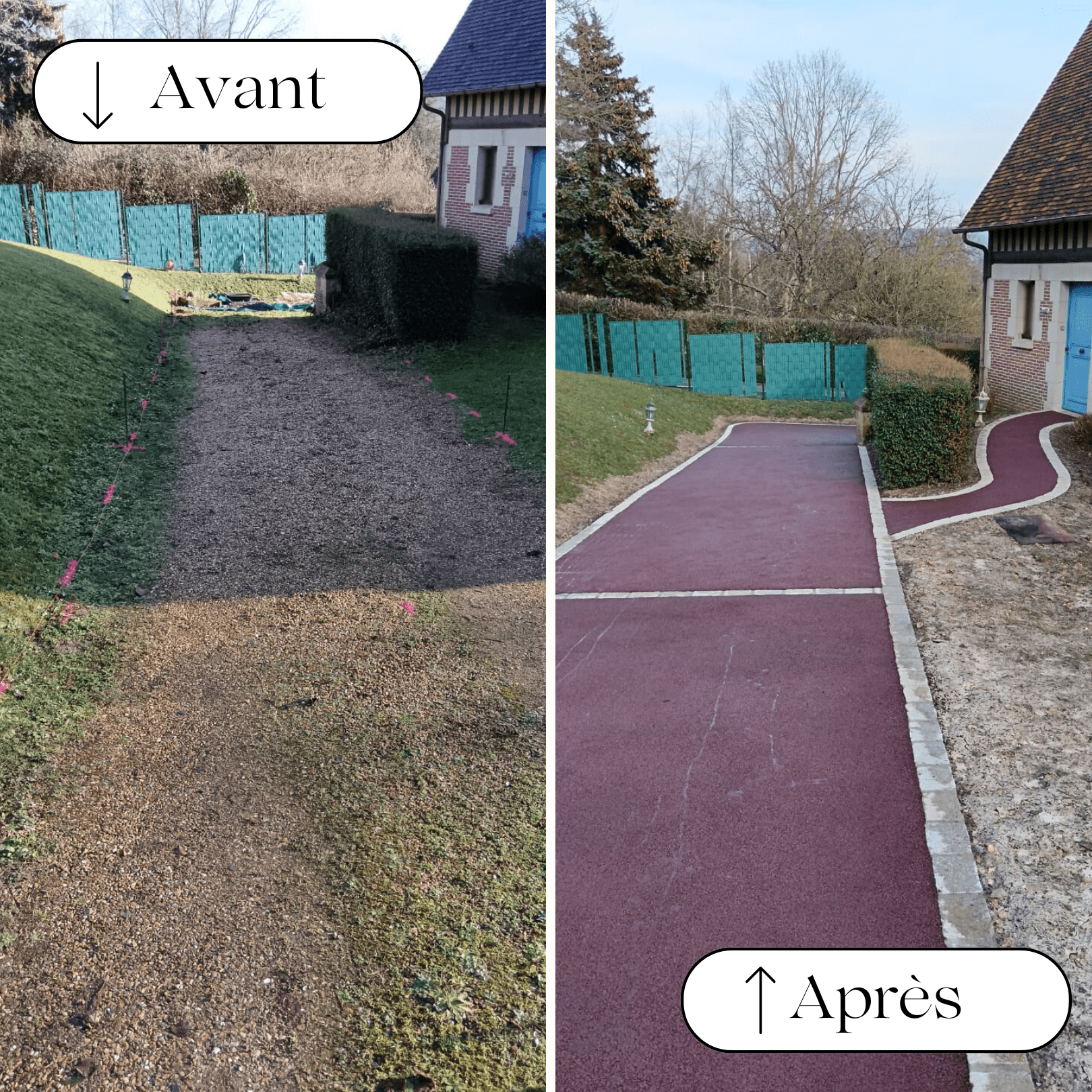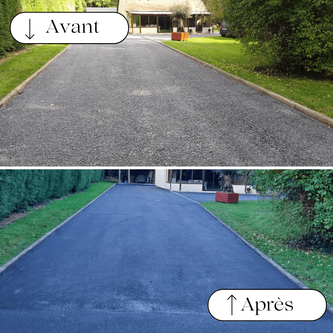 Pour entretenir votre enrobé, nous vous conseillons d’utiliser simplement de l’eau et un balai en effet, l’utilisation de produits solvants ou détergents pourrait détériorer votre enrobé.