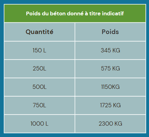- Le béton produit est destiné à des applications non constructives et ne fait référence à aucune norme.